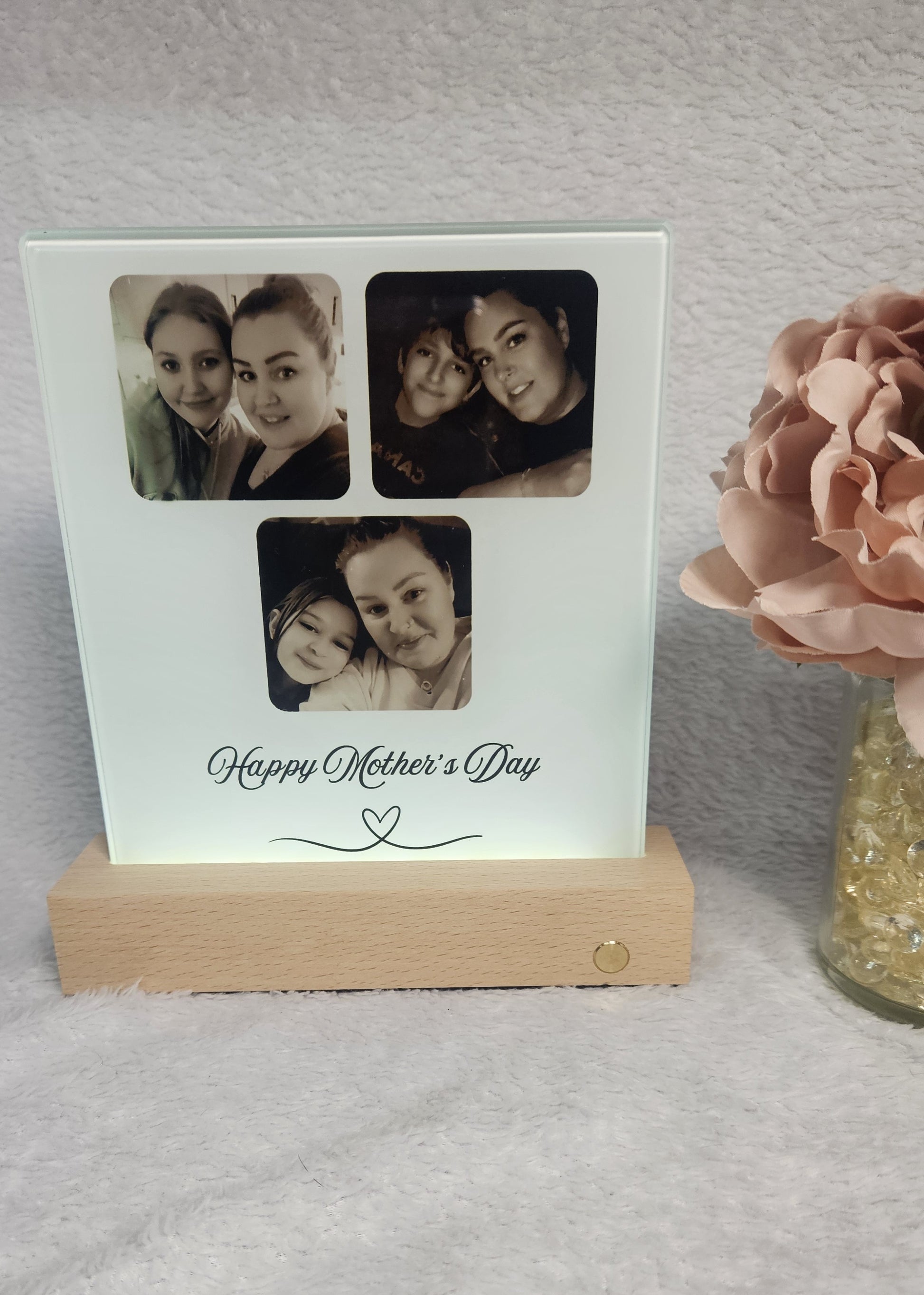 Transform your space with our glass photo panel—a stunning blend of modern technology and timeless elegance. The crystal-clear, waterproof glass showcases vivid, high-definition images with full-surface printing, making every photo captivating and vibrant. Supported by a sturdy, natural wood base, it adds a touch of sophistication while ensuring stability. Elevate your memories with the rechargeable LED light strip, offering up to 5 hours of warm illumination that turns your photos into glowing centrepieces. Whether as a unique decor piece or a heartfelt gift, this photo panel reimagines the traditional frame with modern flair.